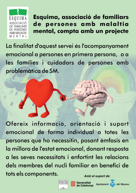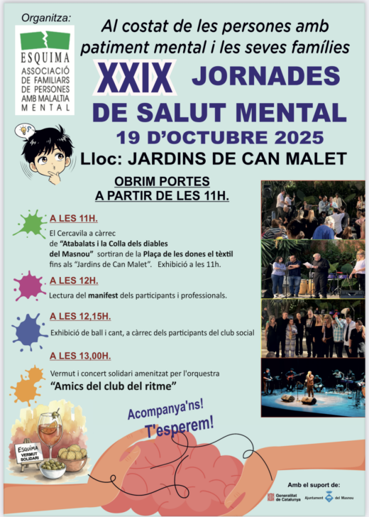 29ª Diada de Salut Mental Esquima En el marc dels actes de la Diada Mundial de la Salut Mental, Esquima amb el suport de l’Ajuntament del Masnou i el Departament de Drets Socials de la Generalitat, organitza la 29a Diada de Salut Mental. És una jornada especial per poder mostrar i compartir amb la comunitat, la necessitat de treballar plegats per tal d’aconseguir materialitzar totes les necessitats que té el col·lectiu de persones amb problemàtiques associades a la salut mental, en Drets Socials. Per nosaltres és important compartir amb la població un dia de germanor i esbarjo, ple de música i actuacions en primera persona. Us convidem a acompanyar-nos en un dia tan especial!!